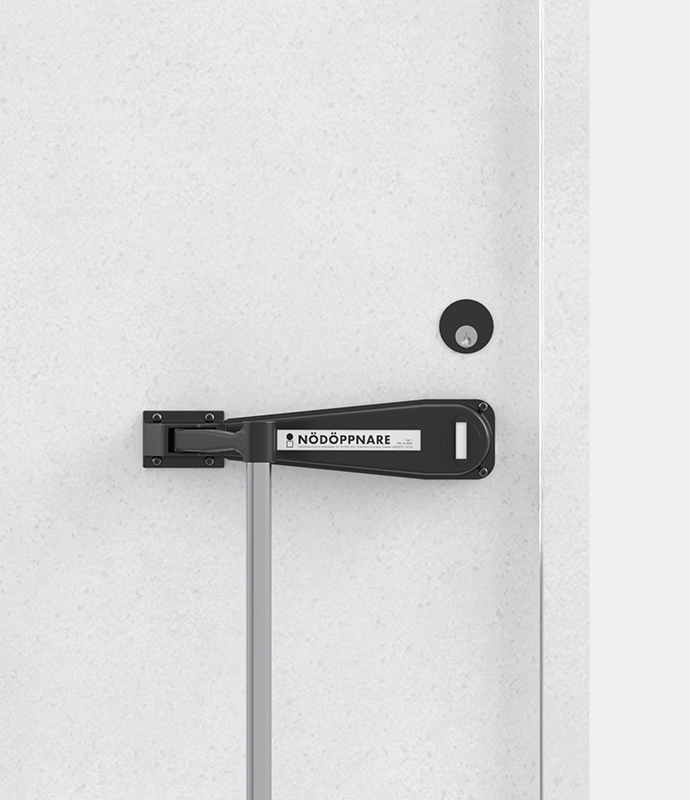 Nödöppnare Typ T EL skall monteras på befintliga split spindle lås där man använder trycket för att öppna dörren. Exempel på ett sådant lås är ASSA Abloy EL580, StepLock 110, eller Safetron SL 520. Regeln är vändbar, så höger– eller vänsterhängd dörr behöver inte anges vid beställning. Den är testad och godkänd enligt SS 3523:2022.